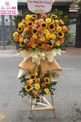 Kệ hoa trong hình là sự kết hợp tinh tế giữa hoa hướng dương, hồng vàng, cam và baby trắng, tạo nên tổng thể ấm áp, tươi sáng và sang trọng.