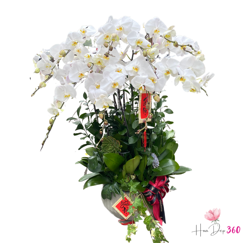 Mô tả: Chậu lan hồ điệp trắng với sự kết hợp tinh tế giữa hoa lan trắng thanh nhã và những bông sen đá mạnh mẽ tạo nên một tác phẩm nghệ thuật tự nhiên, vừa thể hiện sự thanh thoát vừa mang đến cảm giác yên bình. Đây là lựa chọn hoàn hảo cho các dịp lễ quan trọng, trang trí không gian sống, hoặc làm quà tặng để thể hiện tình cảm chân thành.