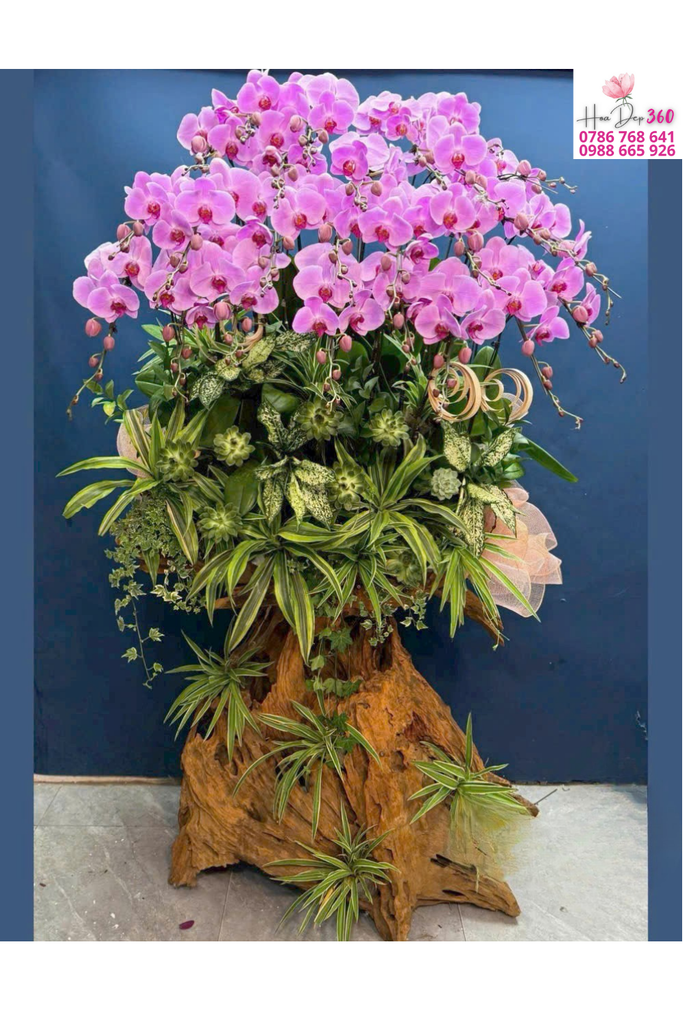 Phối kèm: Lá lan xanh bóng, cây phong thủy lá sọc – lá nhọn giúp tổng thể thêm sinh động và hài hòa.