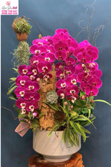 Phối hoa: Các cành lan được tạo dáng lệch tự nhiên, hoa nở dày theo tầng, xen kẽ nụ hồng tròn đầy mang cảm giác tràn sức sống.