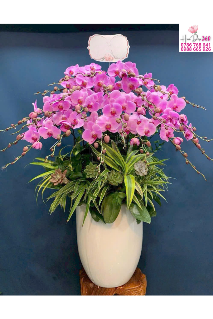Hoa chủ đạo: Lan hồ điệp hồng tươi, sắc hoa ngọt ngào, cánh tròn dày, họng hoa đậm màu tạo cảm giác rực rỡ nhưng vẫn rất tinh tế.