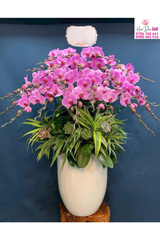 Phối hoa: Các cành lan được uốn rủ mềm mại sang hai bên, hoa nở đều, xen kẽ nhiều nụ non, tạo bố cục tròn đầy, cân đối và cuốn hút.