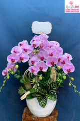 • Hoa chủ đạo: Lan hồ điệp hồng pastel nhẹ nhàng, cánh hoa tròn đều, dày mịn, họng hồng đậm nổi bật, mang vẻ đẹp nữ tính, tinh tế và sang trọng.