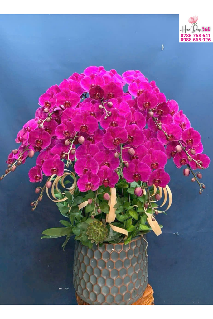 Hoa chủ đạo:Lan hồ điệp hồng đậm (fuchsia) nổi bật, cánh hoa tròn dày, sắc màu rực rỡ và quyến rũ, thể hiện vẻ đẹp sang trọng và tràn đầy sức sống.