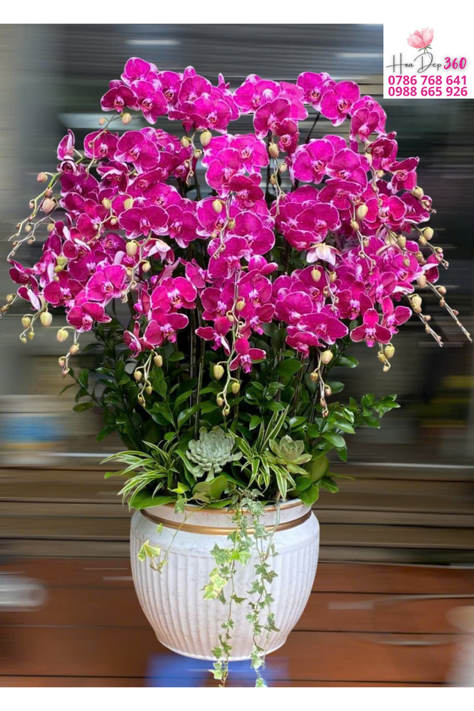 Hoa chủ đạo: Lan hồ điệp hồng đậm ánh tím, cánh hoa tròn dày, viền sáng tinh tế, sắc hoa rực rỡ tạo ấn tượng mạnh mẽ và cao cấp.