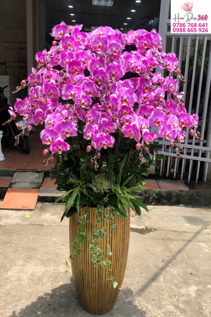 Phối hoa: Các cành lan được uốn dáng vòm tròn cân đối, hoa nở dày đều, xen kẽ nụ non rủ nhẹ, mang cảm giác tràn đầy sức sống và thịnh vượng.