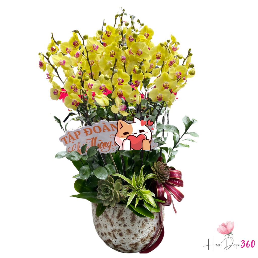 Mô tả: Chậu lan hồ điệp "Phát Tài Phát Lộc" là sự kết hợp tuyệt vời giữa sắc vàng rực rỡ của hoa lan, vẻ đẹp cứng cáp của sen đá, và sự tươi mát của lá chanh cùng cỏ suối. Tất cả được sắp xếp tinh tế trong một chậu hoa sang trọng, mang đến thông điệp về sự phát tài, phát lộc và thịnh vượng. Đây là lựa chọn hoàn hảo cho những dịp khai trương, mừng tân gia, hoặc làm quà tặng cho những người bạn, đối tác trong kinh doanh.