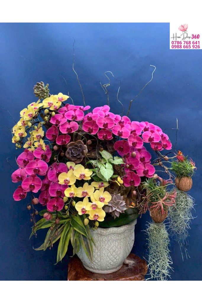 Hoa chính: Lan hồ điệp hồng tím – vàng phối xen kẽ, cánh hoa căng mọng, sắc màu rực rỡ và nổi bật.
