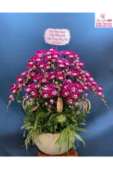 Hoa chủ đạo: Lan hồ điệp tím đậm sang trọng, cánh hoa dày, họng trắng nổi bật, sắc tím tượng trưng cho sự quyền quý và bền vững.