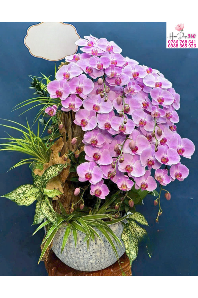Phối hoa: Các cành lan được sắp xếp dày, uốn cong dáng thác mềm mại, hoa nở đều xen kẽ nụ non, tạo cảm giác sinh động, tràn đầy sức sống.