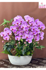 Hoa chủ đạo: Lan hồ điệp tím phấn nhẹ nhàng, cánh hoa tròn mềm mại, họng hồng đậm tạo chiều sâu và nét cuốn hút tinh tế.