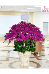 Hoa chính: Lan hồ điệp tím đậm sang trọng, cánh hoa dày, bung nở đồng đều tạo form tròn đầy.