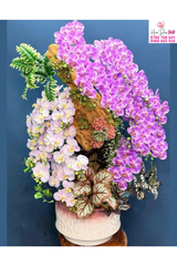 Kiểu chậu: Chậu sứ men loang tông trắng hồng, dáng tròn vững chắc, tôn lên vẻ nghệ thuật và cao cấp của tác phẩm.