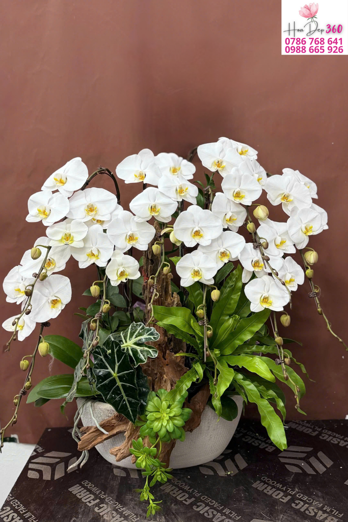 Hoa chủ đạo: Lan hồ điệp trắng tinh khôi, cánh hoa tròn đều, dày và mịn, họng hoa vàng tươi tạo điểm nhấn thanh lịch.