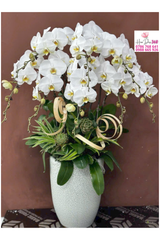 Hoa chủ đạo: Lan hồ điệp trắng tinh khôi, cánh hoa to tròn, họng vàng nhạt nhẹ nhàng, mang vẻ đẹp thuần khiết và sang trọng.