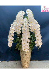 Kiểu chậu: Chậu dáng cao họa tiết đá mài cao cấp, gam màu trung tính, giúp tôn trọn vẻ đẹp thuần khiết của hoa lan.