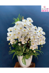 Hoa chủ đạo: Lan hồ điệp trắng tinh khôi, cánh hoa tròn đều, họng vàng nhẹ tạo điểm nhấn thanh lịch và nổi bật.