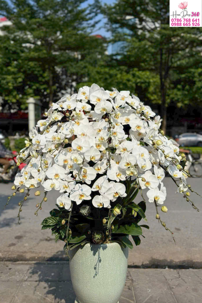 Phối hoa: Các cành lan được uốn cong rủ đều tạo dáng vòm tròn đầy, hoa nở dày xen kẽ nụ non, tổng thể cân đối và rất bắt mắt.