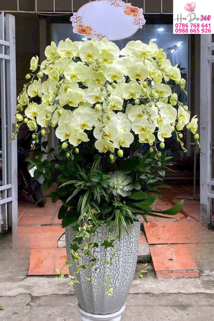Hoa chính: Lan hồ điệp vàng nhạt ánh kem, cánh tròn đều, mịn màng, hoa nở dày và phân tầng hài hòa, tạo cảm giác đầy đặn và cao cấp.
