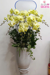 Hoa chủ đạo: Lan hồ điệp vàng nhạt, cánh hoa lớn, màu sắc tươi sáng, họng hoa vàng cam nổi bật, mang cảm giác ấm áp và thịnh vượng.