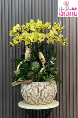 Hoa chủ đạo: Lan hồ điệp vàng tươi rực rỡ, cánh hoa tròn dày, họng hồng tím nổi bật, mang vẻ đẹp sang trọng và tràn đầy năng lượng tích cực.