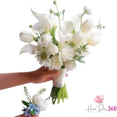 Bó hoa cưới "Tinh Khôi" mang đến sự thanh thoát và trang nhã với sự kết hợp hài hòa từ các loại hoa trắng tinh khôi, thể hiện vẻ đẹp thuần khiết và sự trong trẻo của ngày trọng đại. Thành phần chính của bó hoa là những bông tulip trắng, tượng trưng cho tình yêu vĩnh cửu và sự thanh lịch. Room Hà Lan và Thùy Châu trắng làm nổi bật vẻ dịu dàng, thanh thoát, kết hợp với phăng trắng và cát tường, tạo nên sự mềm mại và lãng mạn cho bó hoa. Bó hoa trắng tinh khôi này không chỉ là điểm nhấn hoàn hảo cho cô dâu mà còn là biểu tượng của tình yêu trong sáng và sự khởi đầu mới mẻ.