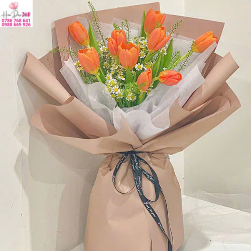 Tone màu: Sắc cam – nâu – trắng hài hòa. Tulip cam rực rỡ được làm dịu lại bởi lớp giấy gói màu nâu nhạt sang trọng và giấy lụa trắng mềm mại bên trong, tạo nên tổng thể thanh lịch nhưng vẫn cuốn hút.