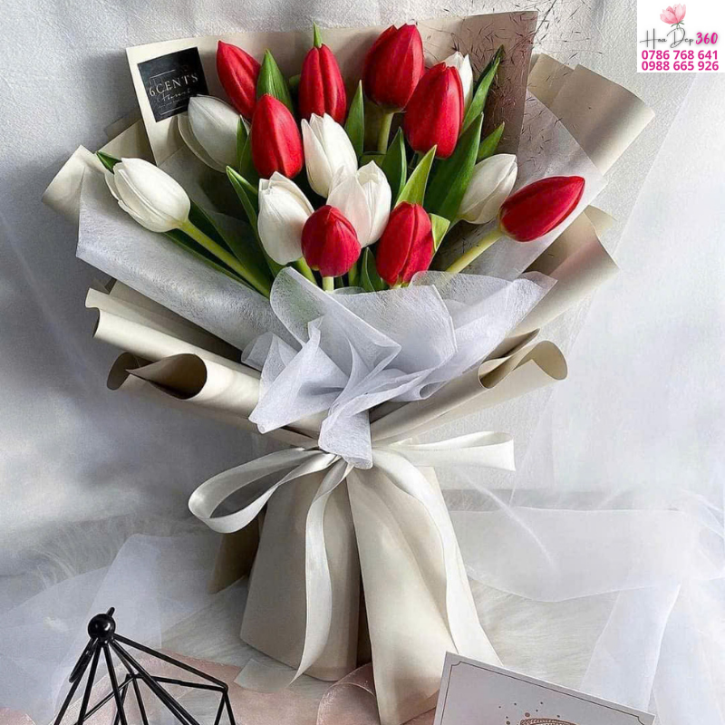 Hoa chủ đạo: Sự kết hợp tinh tế giữa tulip đỏ rực rỡ và tulip trắng tinh khôi. Màu đỏ tượng trưng cho tình yêu nồng nhiệt, trong khi sắc trắng mang vẻ đẹp thuần khiết, tạo nên một tổng thể hài hòa và sang trọng.
