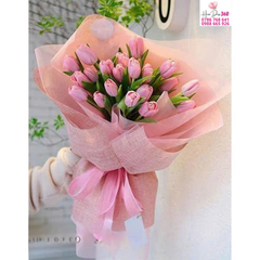 Hoa chủ đạo: Bó tulip hồng pastel với số lượng dày dặn, bông khoẻ, dáng hoa thon dài và màu hồng nhẹ nhàng – tạo nên vẻ đẹp thanh lịch và trang nhã.
