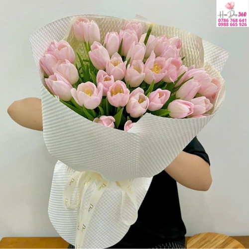 Hoa chủ đạo: Bó tulip hồng pastel được tuyển chọn với dạng bông tròn đầy, cánh hoa mềm thương mại và sắc hồng dịu nhẹ, mang đến vẻ đẹp tinh tế và sang trọng.
