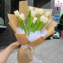 Hoa chủ đạo: Bó tulip trắng tinh khôi, cánh hoa khép nhẹ mang vẻ đẹp thanh lịch và thuần khiết. Sắc trắng nhẹ nhàng tạo cảm giác trong trẻo, trang nhã và hiện đại.