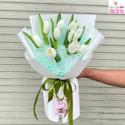 Giấy gói: Sử dụng giấy trắng kết hợp với lớp giấy lót xanh pastel nhẹ nhàng, làm nổi bật sắc trắng tinh tế của tulip. Cách gói nhiều lớp tạo độ phồng sang trọng và hiện đại.