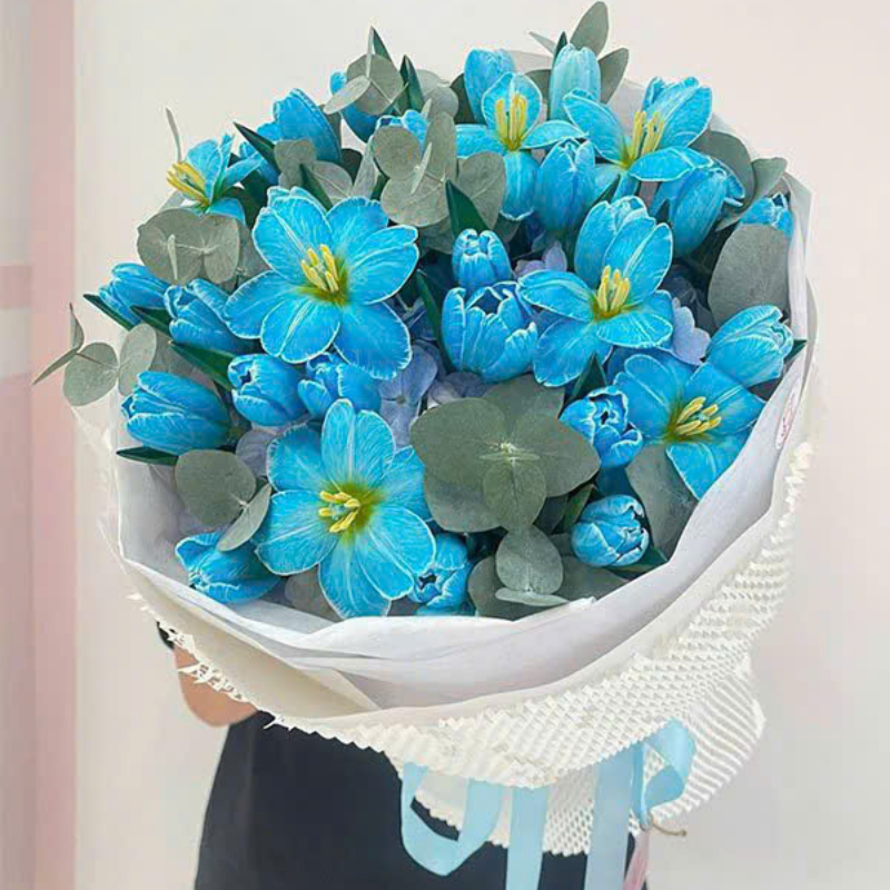 Hoa chủ đạo: Tulip xanh biển độc đáo, cánh hoa tươi sáng, mang vẻ đẹp nổi bật và cuốn hút hiếm gặp.