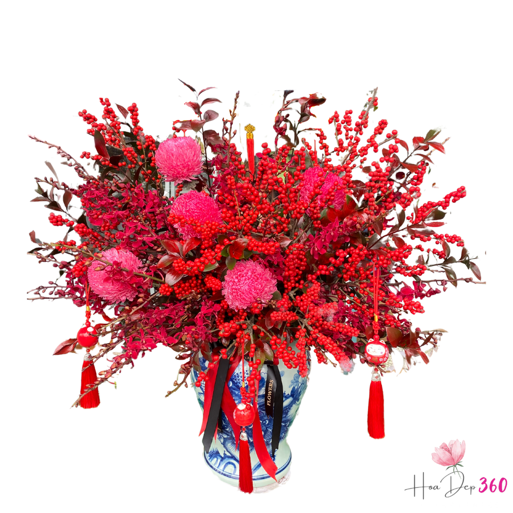 Bình đào đông "Xuân Hồng Thịnh Vượng" là sự kết hợp hoàn hảo giữa sắc đỏ rực rỡ của 15 cành đào đông, vẻ tươi tắn của cúc mẫu đơn hồng và sự thanh mát của lá chanh. Thiết kế tinh tế với nơ và những khánh trang trí không chỉ làm nổi bật không gian sống mà còn mang đến thông điệp về sự thịnh vượng, may mắn và hạnh phúc trong mùa xuân. Đây là món quà ý nghĩa và đầy sang trọng để trang trí trong các dịp lễ hội hoặc tặng người thân yêu.
